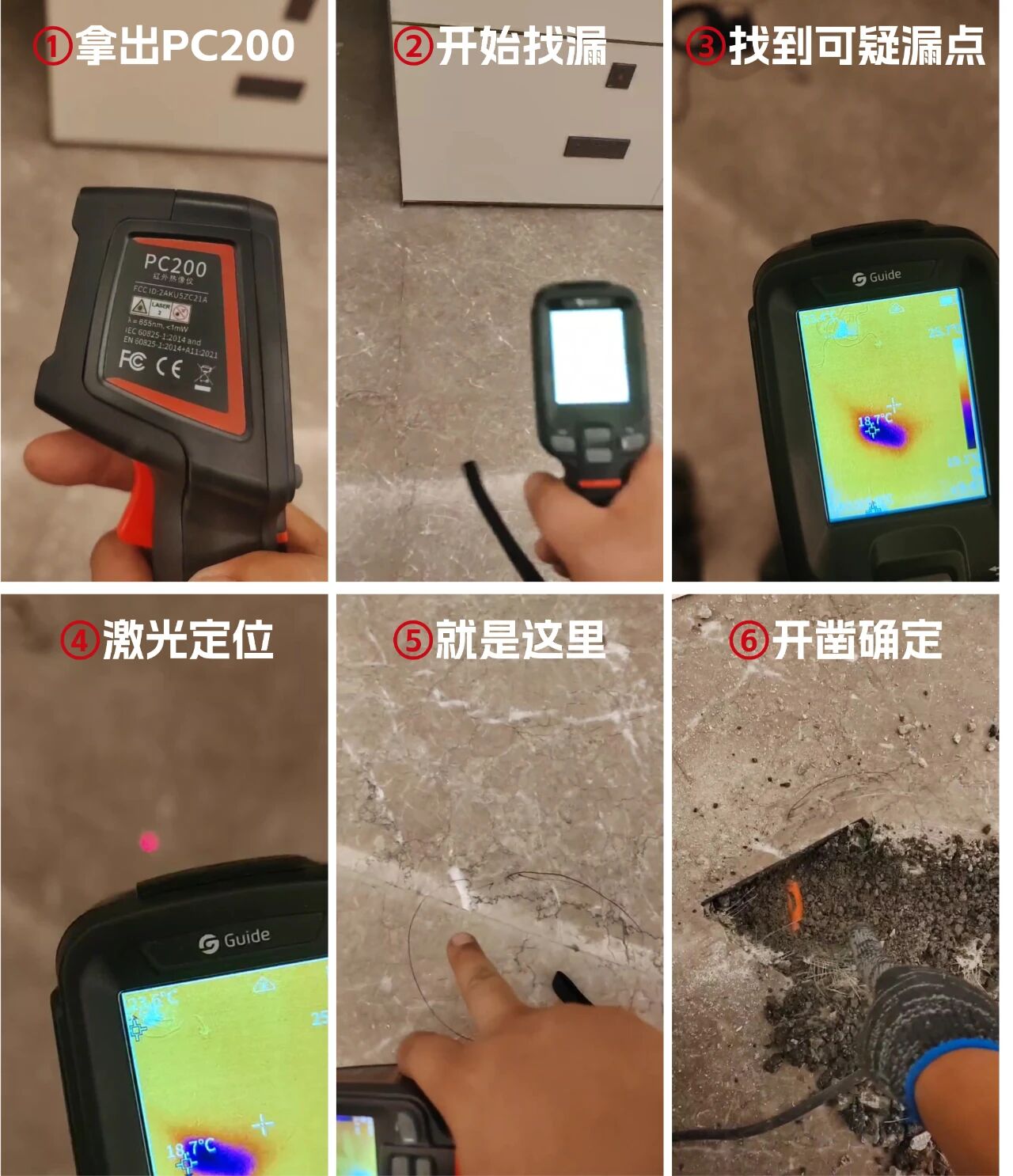 這種細(xì)微的溫差人眼無法感知,卻是紅外熱像儀鎖定漏點(diǎn)的關(guān)鍵線索。它通過接收物體表面的紅外輻射,實(shí)時(shí)生成高清熱圖,漏點(diǎn)在熱像圖中清晰可視。王師傅將漏點(diǎn)展示給業(yè)主,真正做到一目了然、有據(jù)可依,有效避免了后續(xù)的疑慮與糾紛。這不僅讓維修過程變得極快,更從根源上避免了盲目開挖帶來的巨大經(jīng)濟(jì)損失,是一種真正高效且經(jīng)濟(jì)的檢漏工具。最終確定漏水位置,王師傅贏得了業(yè)主的滿意與信任。