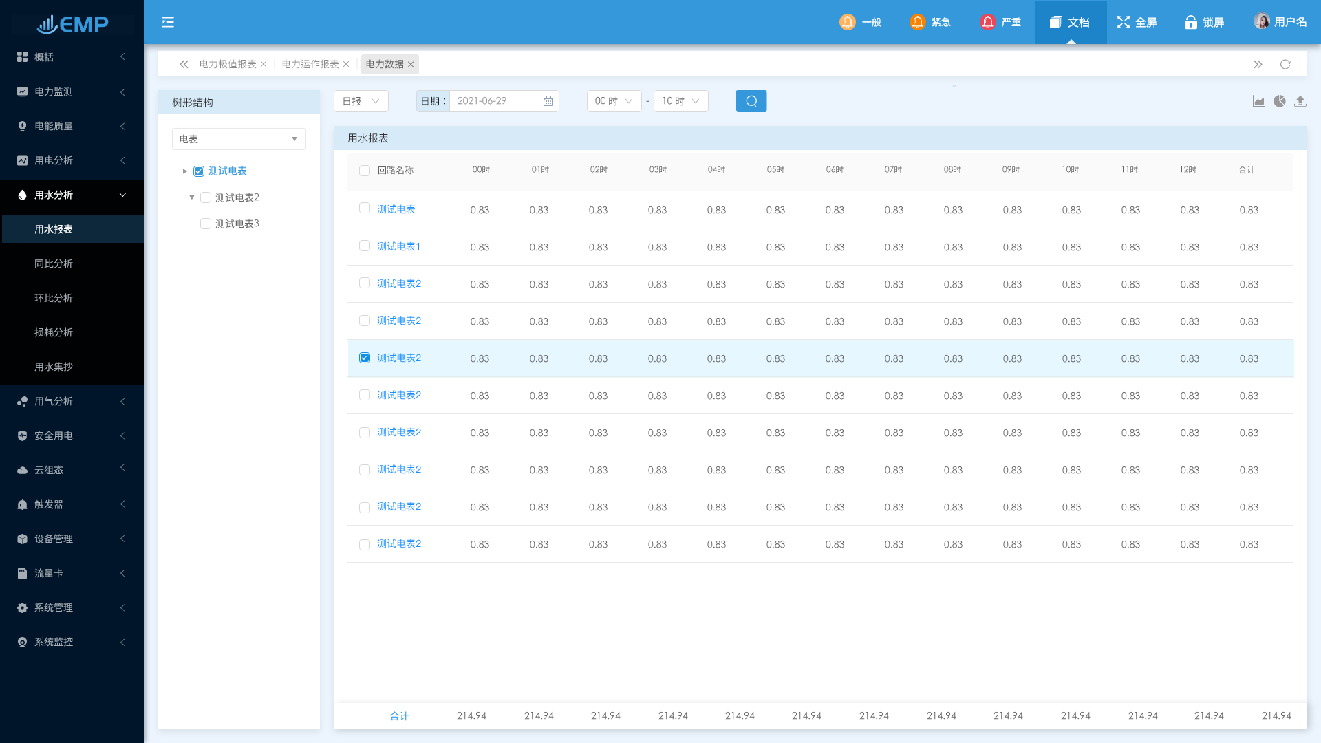 energye能耗管理平臺(tái)中的用水分析包含了:用水報(bào)表、同比分析、環(huán)比分析、損耗分析、用水集抄等功能。