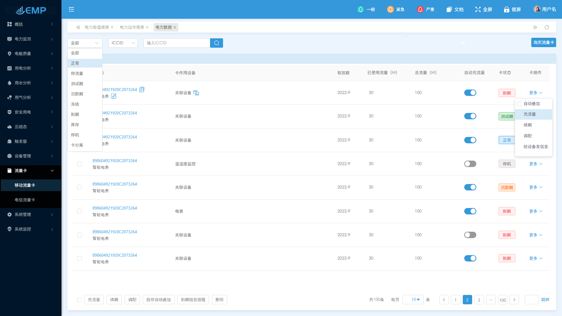 列表里面可以清晰的顯示流量卡的信息,例如:流量卡號(hào)、卡安裝設(shè)備、流量卡的有效期、流量顯示、剩余流量顯示、流量卡的狀態(tài)(正常或異常情況)、卡操作(充流量、卡續(xù)期、卡號(hào)調(diào)配到另外賬號(hào)等)。