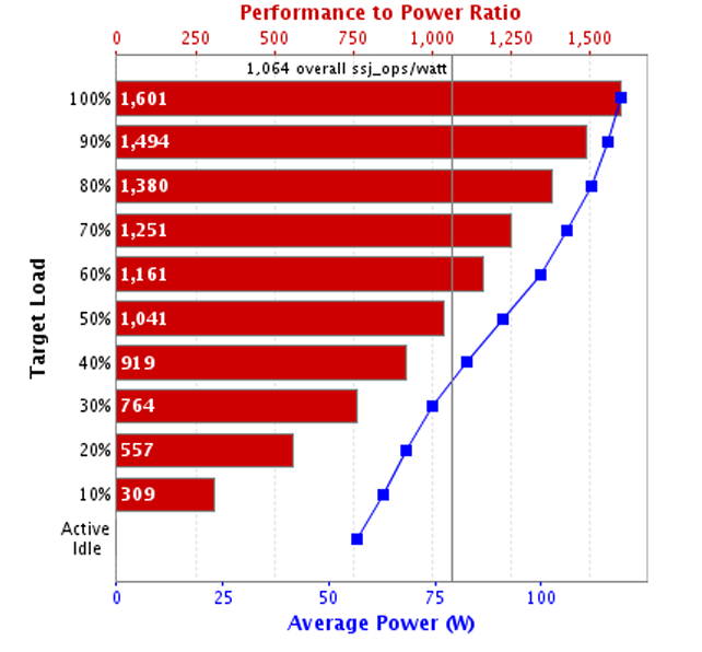 SPECpower?是由SPEC(標(biāo)準(zhǔn)性能評估組織)開發(fā)的一種性能/功耗比基準(zhǔn)測試工具,是一套標(biāo)準(zhǔn)化的軟件測試腳本,通過模擬從100%滿載到活動空閑(Active Idle)狀態(tài)共11個不同負載點,來全面測量服務(wù)器的性能和功耗,最終計算出一個核心指標(biāo):ssj_ops/watt(每瓦特支持的業(yè)務(wù)處理量)。這個數(shù)值越高,服務(wù)器的能源效率就越高。也正因其權(quán)威性,目前國內(nèi)主流運營商在服務(wù)器集采招標(biāo)時,都會要求提供基于SPECpower?的測試報告。圖2 基于SPECpower_ssj2008基準(zhǔn)測試結(jié)果- 紅色條 (性能功耗比): 代表每個負載點的效率,條形越長、數(shù)值越高越好。