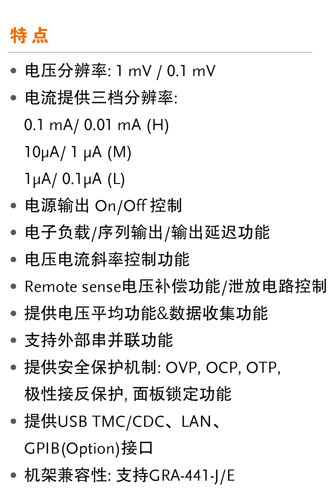 設(shè)定/回讀分辨率達(dá) 1 mV / 0.1 mV,提供精細(xì)的電壓控制。